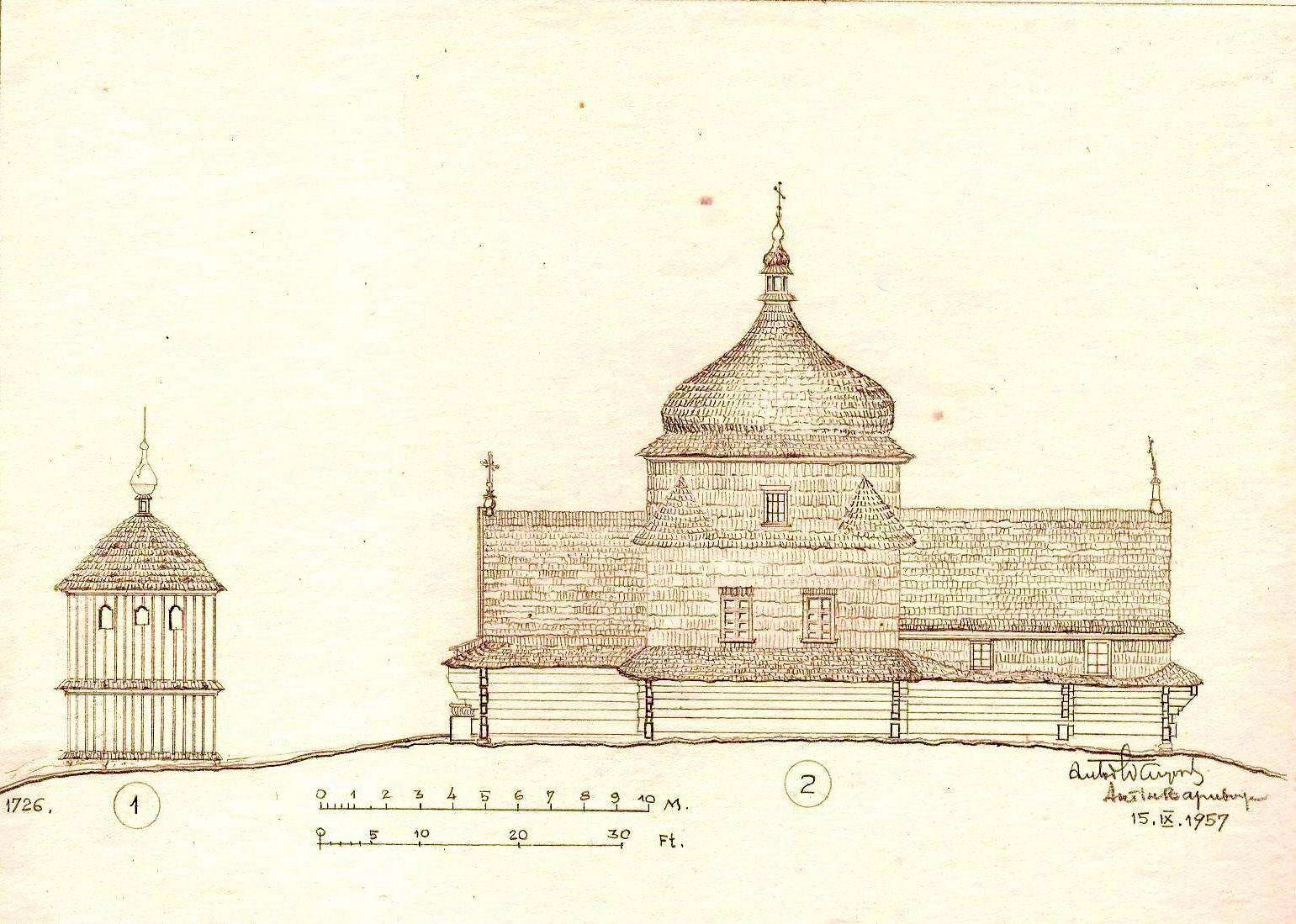 ФасадРозмір зображення: 1541:1099 піксел Рисунок Антона Вариводи (Краків), 15.09.1957 р. 1726 Church, Chertezh (Czertez), Sanok. 1 – South elevation of belltower; 2 – South elevation of church. |