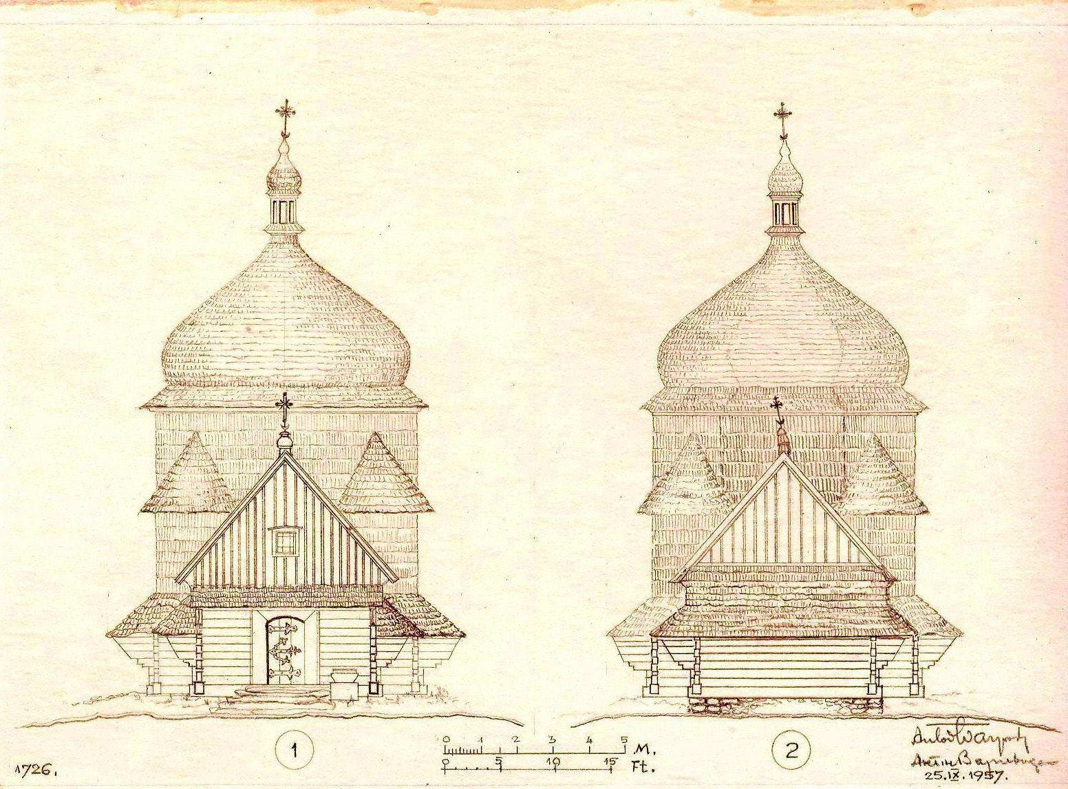 ФасадиРозмір зображення: 1552:1146 піксел Рисунок Антона Вариводи (Краків), 25.09.1957 р. 1726 Church, Chertezh (Czertez), Sanok. 1 – West elevation; 2 – East elevation. |