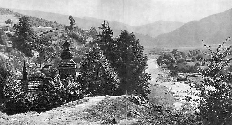[1970 р.] Панорама долини з церквою. Вигляд з позиції С4Розмір зображення: 800:431 піксел Джерело: Гоберман Д. Н. Памятники деревянного зодчества Закарпатья. – Ленинград: Аврора, 1970 г. |