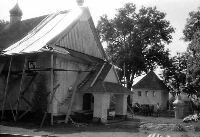 1991 р. Бабинець церкви і дзвіниця. Вигляд з північного заходу