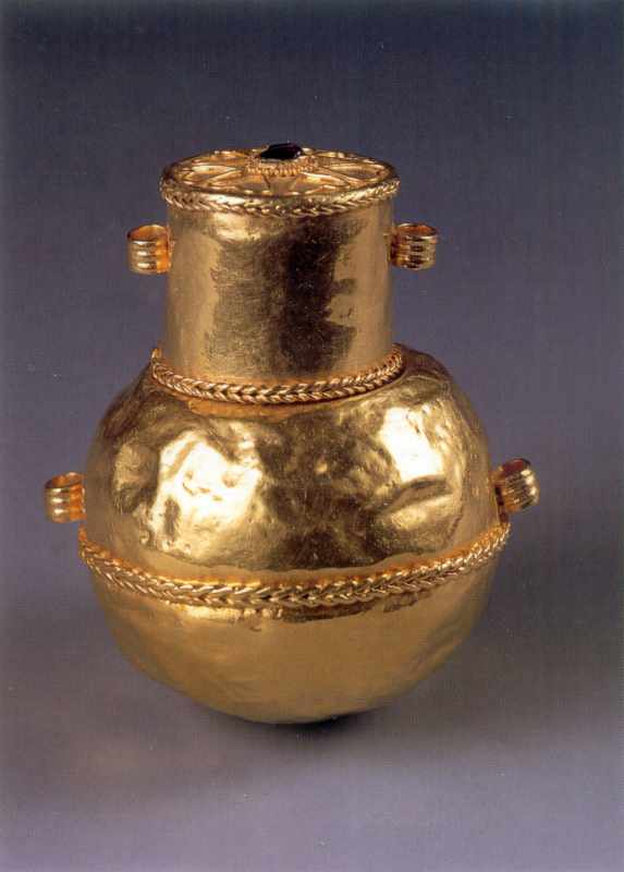 Золото, гранат, скло. Висота 5.3 см, діаметр 4 см.