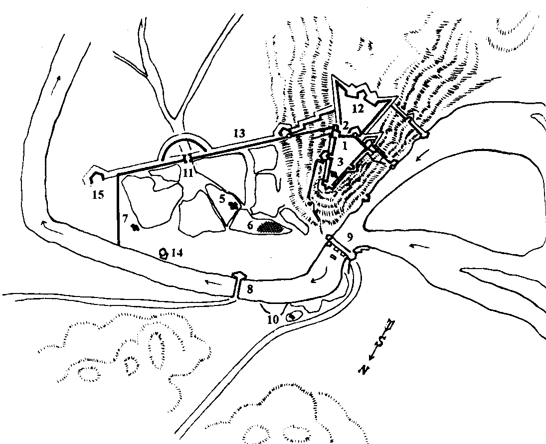 План забудови й укріплень Чигирина на 1678 р. Реконструкція Т.БажановоїРозмір зображення: 1095:891 піксел Джерело: Пам’ятки України, 2002 р., № 2, с. 34. |