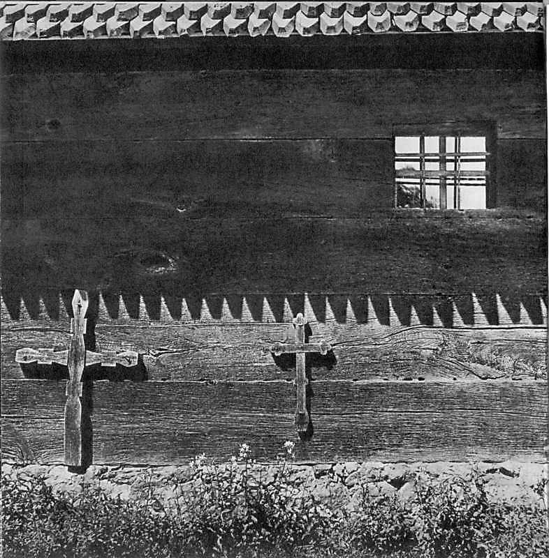[1970 р.] Фрагмент бічної стіни. Вигляд з позиції С2Розмір зображення: 786:800 піксел Джерело: Гоберман Д. Н. Памятники деревянного зодчества Закарпатья. – Ленинград: Аврора, 1970 г. |