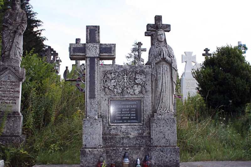 Ліворуч – надгробок з написом: «Тут спочиває р. Б. Влостецкивъ 1877 – 1907. Поставила вдячна жема Марія в році 1908».