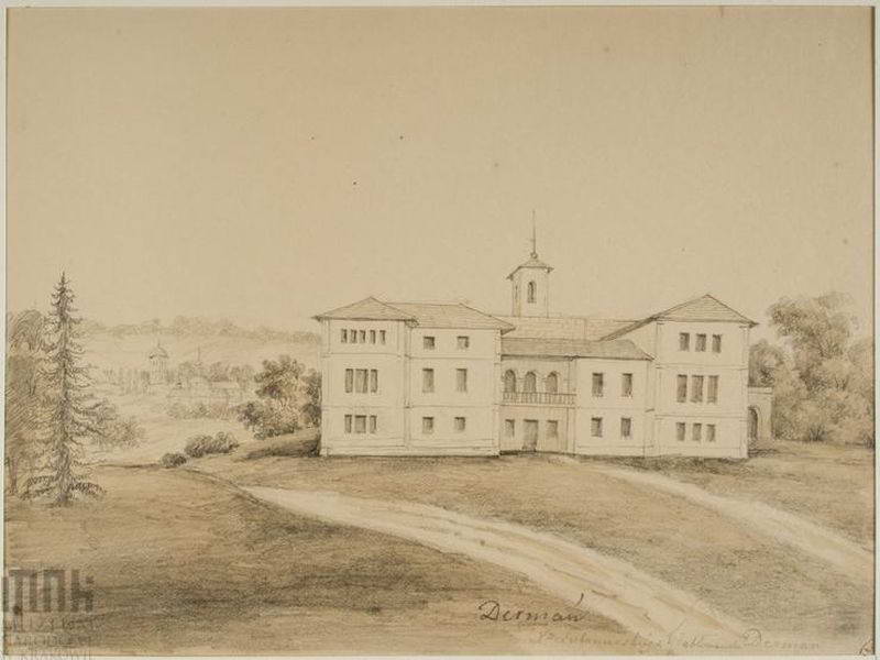 Pałac Lubomirskich. Widok od strony drogi. Pałac, w części środkowej dwukondygnacjowy z loggią na pierwszym piętrze i trzykondygnacjowymi częściami bocznymi oraz czworoboczną wieżą. 1862 – 1876. Napis: Dermań Xy Lubomirskiej z Jabłonowskich; Dermań; napis na podkładzie: Wołyń. Dermań. Rys. ołówkiem podmalowany sepią, 18,4x24,6. III-r.a. 4157 (Teka Wołyń). [Katalog rysunków architektonicznych ze zbiorów Muzeum narodowego w Krakowie. 1. Rysunki Napoleona Ordy / Opracowały Zofia Kucielska i Zofia Tobiaszowa. – Warszawa: Państwowe wydawnictwo naukowe, 1975, Nr. 145]