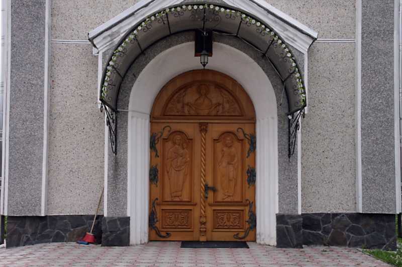 2014 р. Портал із різьбленими дверимаРозмір зображення: 800:533 піксел Фото Зенона Боровця і Богдана Тхора, 9 липня 2014 р. В тимпані – Покрова; на стулках: ліворуч – богородиця провідниця, праворуч – Ісус Христос. |