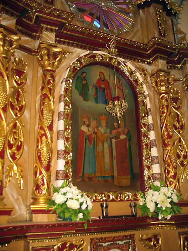 Ікона розміщена у вівтарній частині на торцевій стіні (під круглим вікном). Фото Зенона Боровця і Богдана Тхора, 9 липня 2014 р.