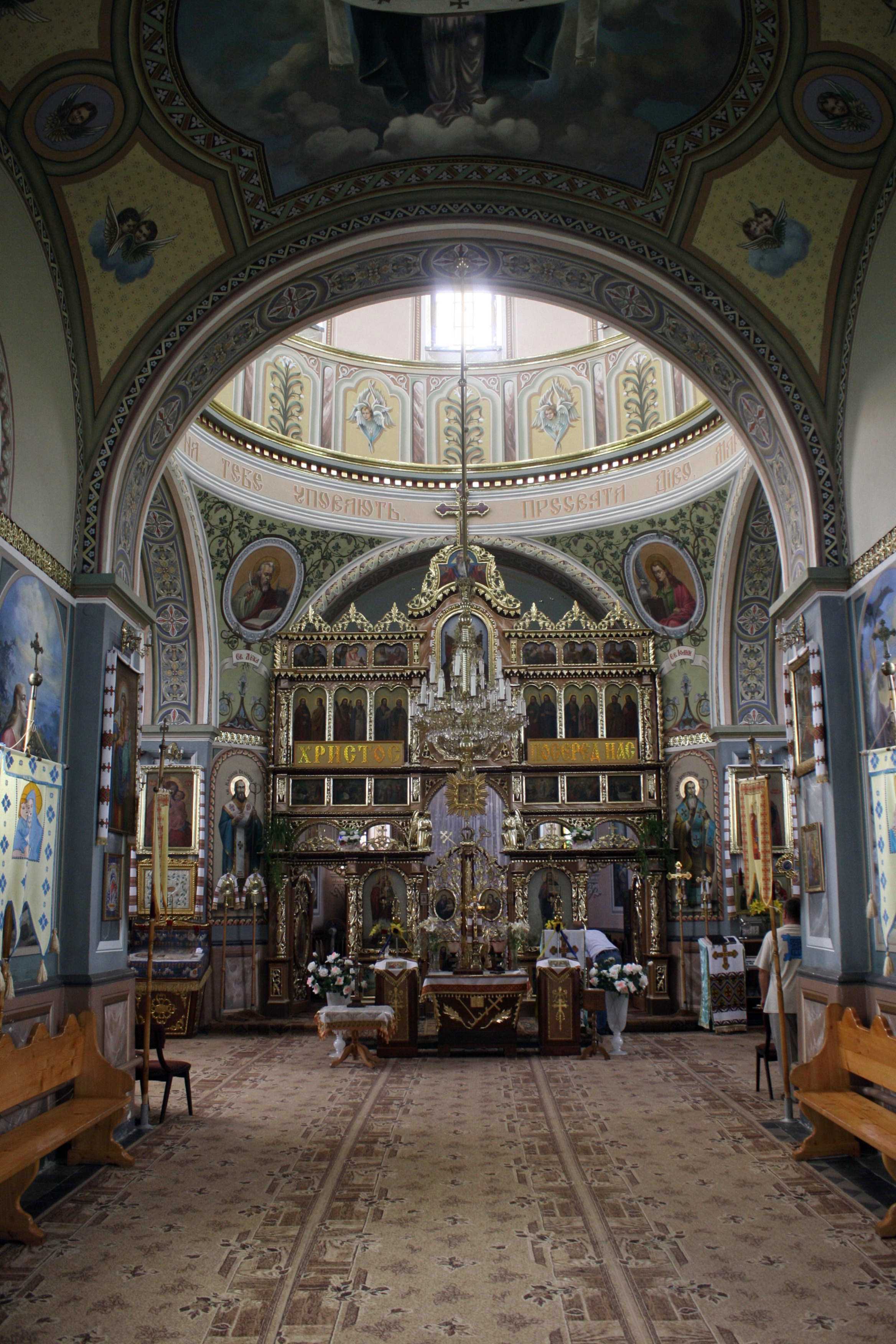 Інтер’єри Розмір зображення: 2336:3504 піксел Фото Зенона Боровця і Богдана Тхора, 9 липня 2014 р. Найчастіше переглядають Лівий бічний вівтар (+) Ікона «Оплакування Христа» (+) Інтер’єр вівтаря (+) Вкладені елементи Інтер’єр вівтаря (+) Вид на іконостас із хорів (з лівого боку) Вид на іконостас із хорів (з правого боку) Іконостас (з лівого боку) Іконостас (з правого боку) (+) Ліва верхня частина іконостаса Центральна частина іконостаса Права верхня частина іконостаса Лівий бічний вівтар (+) Правий бічний вівтар (+) Інтер’єр купола Покрова. Стінопис склепіння Інтер’єр нави з видом на хори Ікона «Богородиця провідниця» (+) Ікона «Оплакування Христа» (+) Картина «Несіння тіла Ісуса»