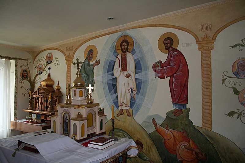 Преображення. Стінопис вівтаря Розмір зображення: 800:533 піксел Фото Зенона Боровця, 11 лютого 2016 р. Вкладені елементи Пророк Ілля та Ісус Христос Пророк Мойсей та фрагмент древа Ієсеєвого