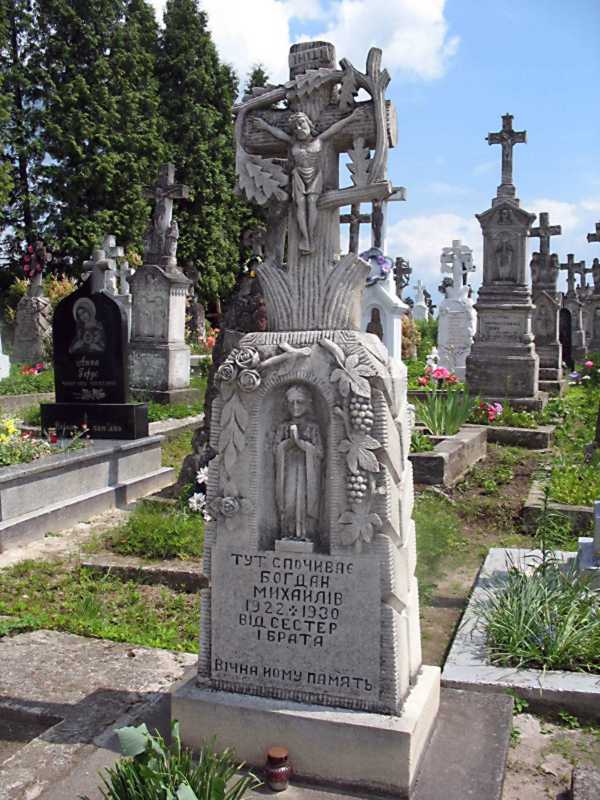 Могила Б. МихайліваРозмір зображення: 600:800 піксел Фото Зенона Боровця, 3 червня 2012 р. Напис: «Тут спочиває Богдан Михайлів 1922 – 1930. Від сестер і брата. Вічна йому пам’ять». |