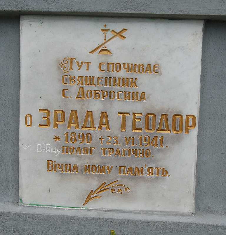 Напис: «Тут спочиває священик с. Добросина о. Зрада Теодор (1890 – 23.06.1941). поляг трагічно. Вічна йому пам’ять».