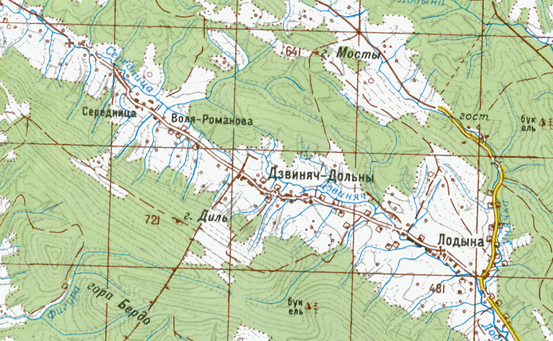 Карта (Дзвиняч-Дольни)Розмір зображення: 1081:667 піксел Карта Київської військово-картографічної фабрики, масштаб 1:100000, аркуш 106, друк 2001 р. (за матеріалами 2000 р.). |