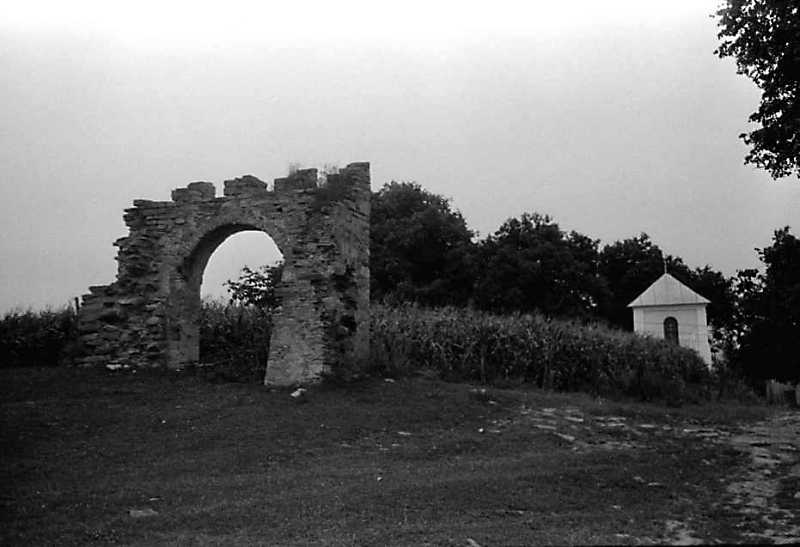 1989 р. Брама замку і дзвіниця церкви. Вигляд із заходу