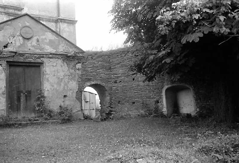 1989 р. Фрагмент західного фасаду костелу, південна брама і мур. Вигляд з північного заходу