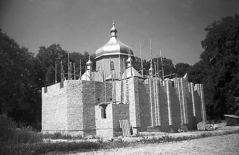 1994 р. Нова церква на тлі старої. Вигляд з позиції А1Розмір зображення: 800:518 піксел 1994 р. 29 липня. Фото М.І.Жарких. Негатека, № 847-38. |