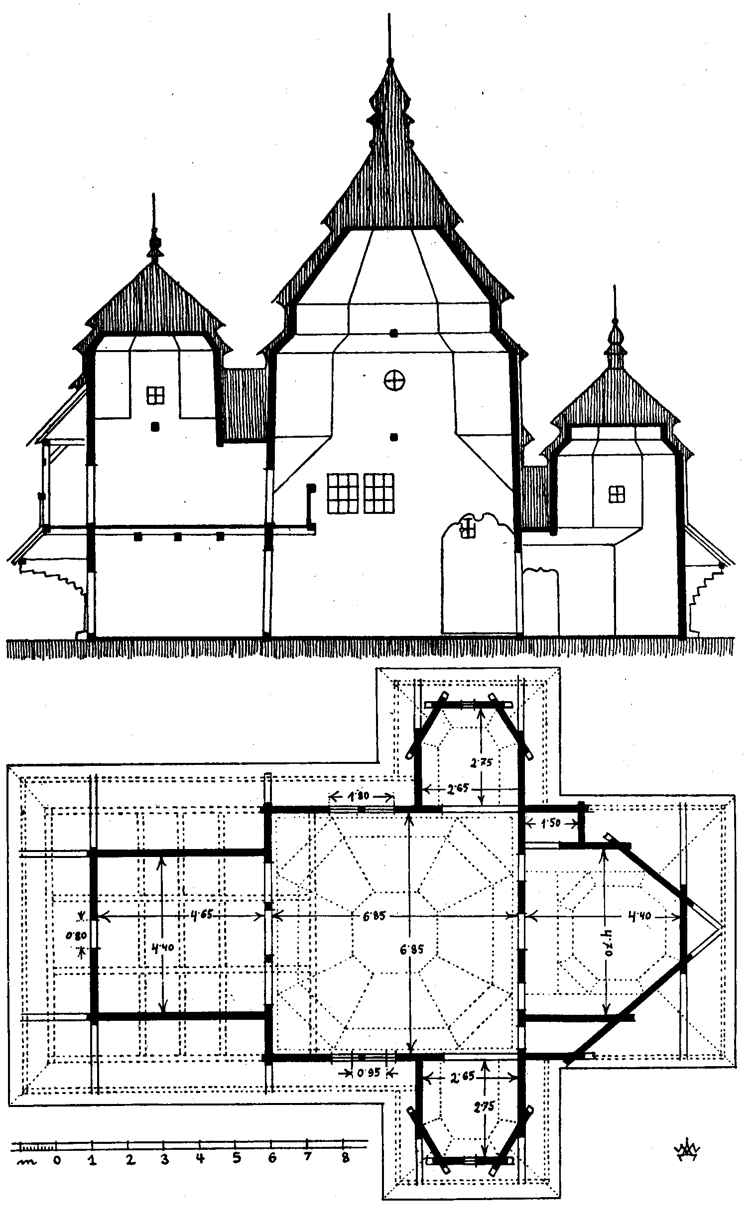 Поздовжній переріз і планРозмір зображення: 1516:2462 піксел Церква в с.Довге біля Східниці, 1723 р. (дерев.). Джерело: Драган М. Українські деревляні церкви. – Льв.: 1937 р., т. 2, с. 43. |