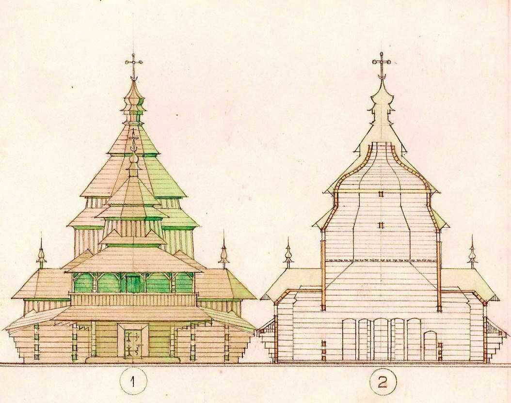 1930 р. Фасад і перерізРозмір зображення: 1054:832 піксел Рисунок Антона Вариводи (Краків), 20.08.1930 р. 1645 Church, Dovhe (Dolhe), Striy, Ukraine. 1 – West elevation showing main entrance; 2 – Transverse section; |