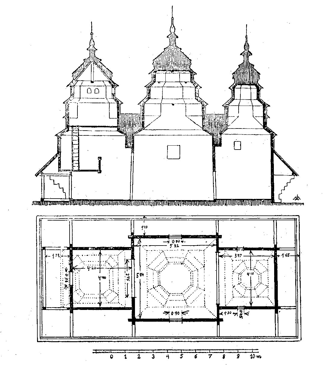 Поздовжній переріз і планРозмір зображення: 1102:1213 піксел Джерело: Драган М. Українські деревляні церкви. – Льв.: 1937 р., т. 2, с. 83. |