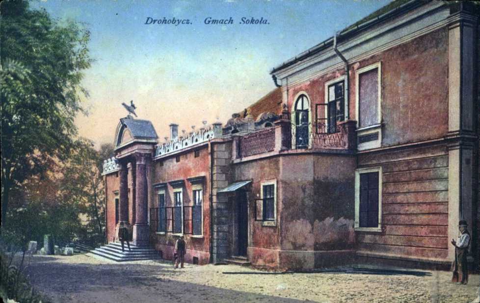 Поштівка: будинок «Сокола» в Дрогобичі. – Drohobycz, gmach Sokoła. – W Drohobyczu : wydawnictwo kart widokowych księgarni J. Pilpla, 1914 (GGJ) (pocztówka); 9 × 13 cm