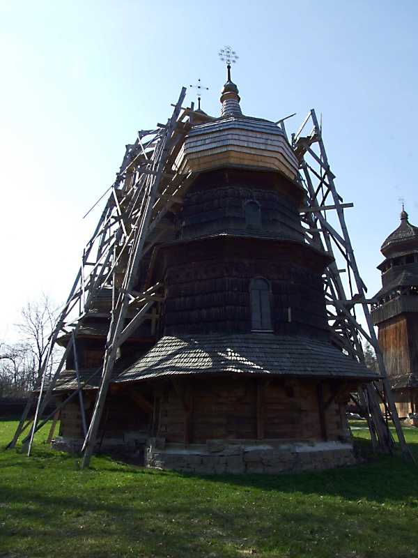 2013 р. Загальний вигляд зі сходу Розмір зображення: 600:800 піксел 17 квітня 2013 р. Фото М.І.Жарких. Вкладені елементи [2] Цоколь і нижні вінці зрубу