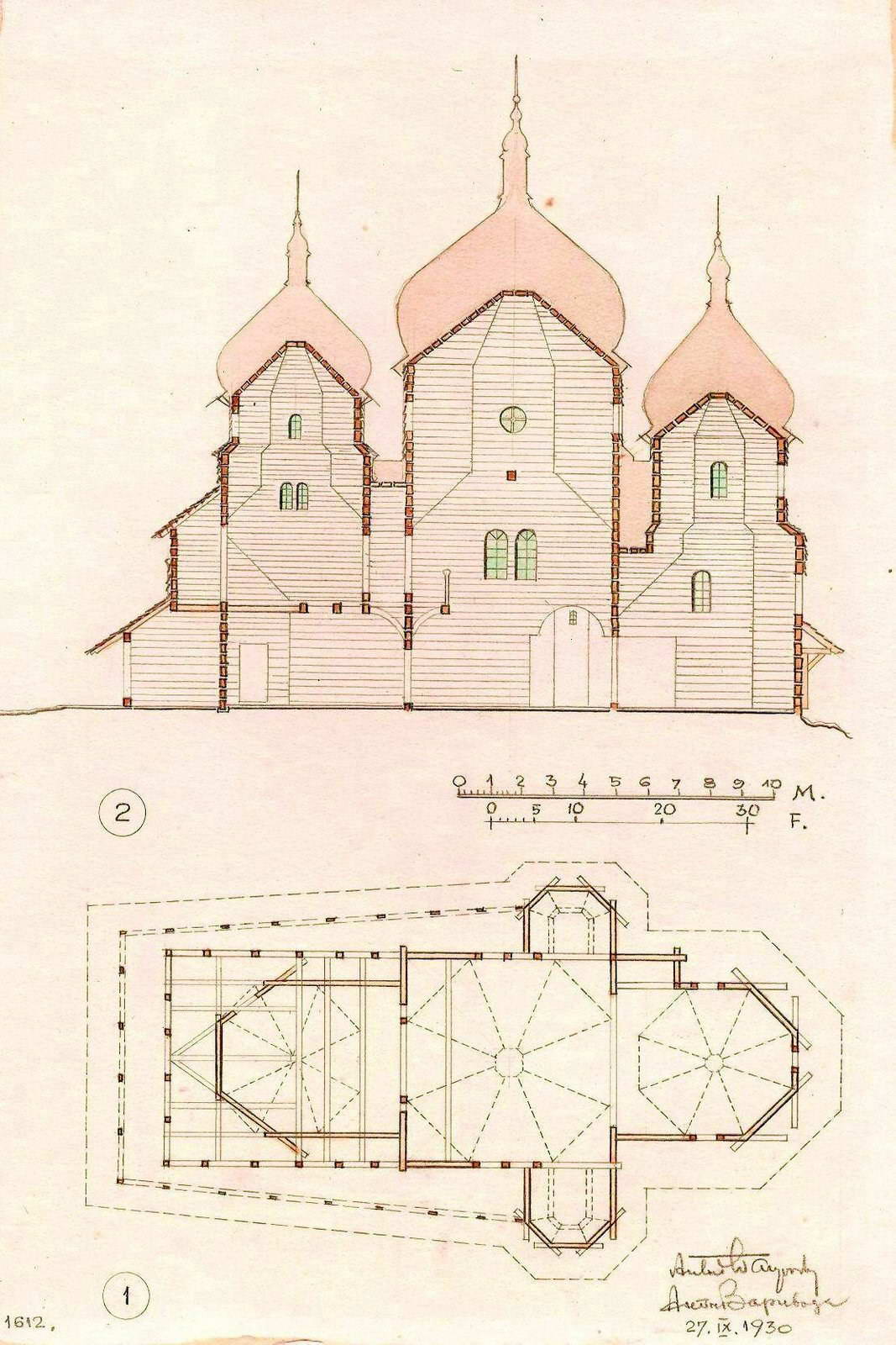 1930 р. Переріз і планРозмір зображення: 1067:1600 піксел Рисунок Антона Вариводи (Краків), 27.09.1930 р. 1612 Church, Drohobych (Drohobycz), Ukraine. 1 – Ground plan showing arrangement of structural beams; 2 – Longitudinal secion. |