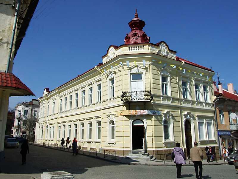 Будинок (№ 1)Розмір зображення: 800:600 піксел Ліворуч – вулиця С. Бандери, праворуч – вулиця Ковальська. 17 квітня 2013 р. Фото М.І.Жарких. |