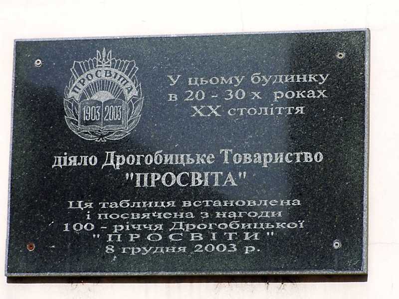 На дошці напис: «У цьому будинку в 20-30- роках 20 століття діяло Дрогобицьке товариство «Просвіта». Ця таблиця поновлена й посвячена з нагоди 100-річчя Дрогобицької «Просвіти» 8 грудня 2003 р.».