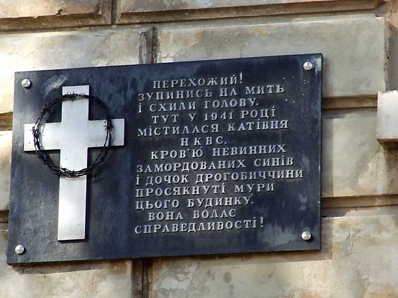 На дошці напис: «Перехожий! Зупинись на мить і схили голову. Тут у 1941 році містилася катівня НКВС. Кров’ю невинних замордованих синів і дочок Дрогобиччини просякнуті мури цього будинку. вона волає справедливості!».