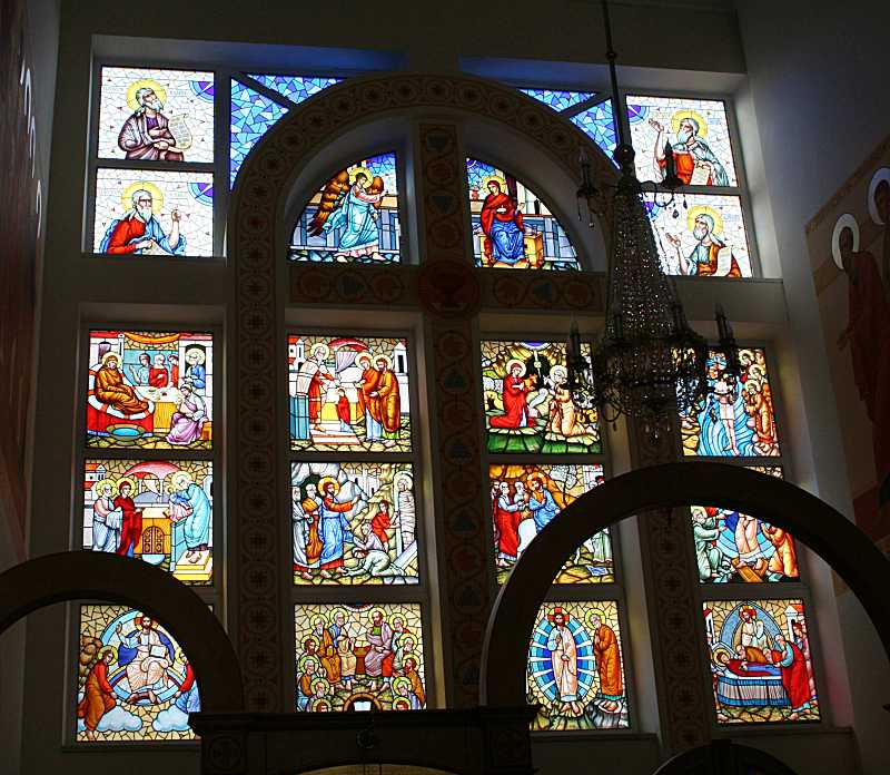 Вітражі (чи живопис на склі?) зображають євагнелістів та празники. Фото Зенона Боровця, 12 жовтня 2017 р.