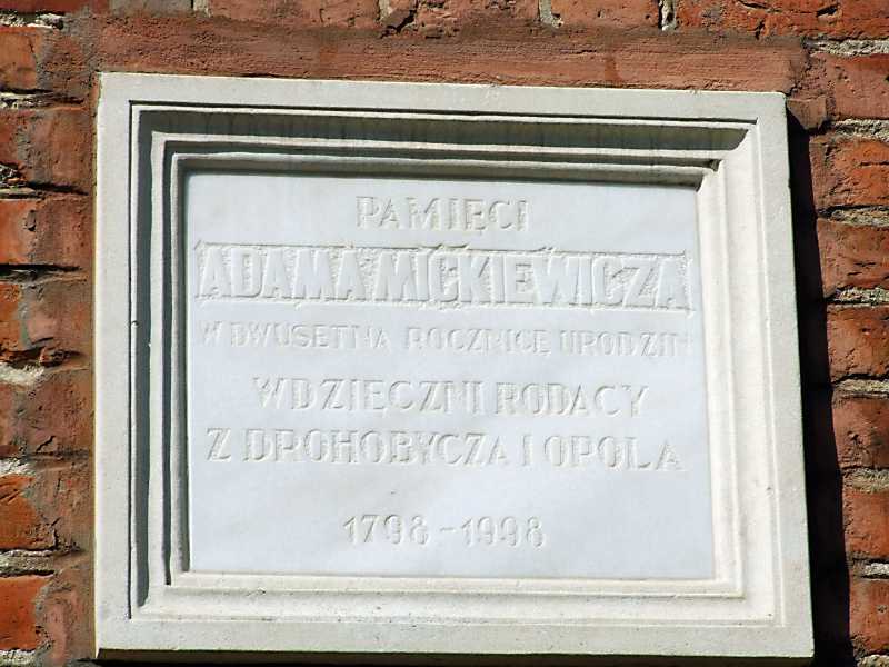 На дошці напис польською мовою: «Пам’яті Адама Міцкевича у двохсоту річницю його народження вдячні співвітчизники з Дрогобича та Ополя. 1798 – 1998».