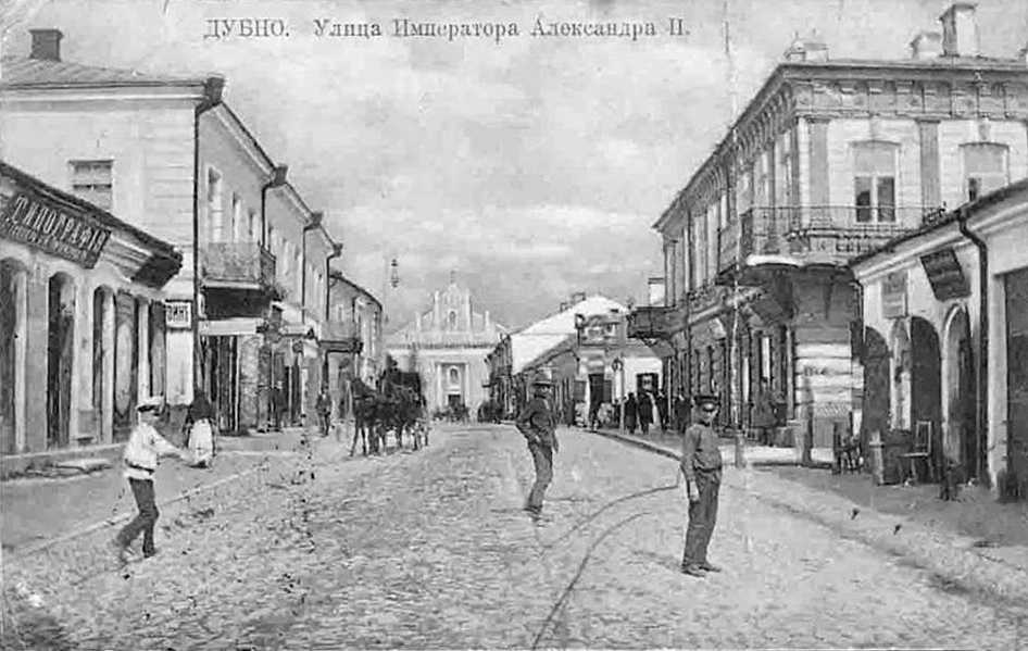1910-і (?) рр. Вулиця з перспективою на костел (2)Розмір зображення: 946:599 піксел Російська поштівка поч. 20 ст. з альбому «Дубенський форт-застава» Вулиця на поштівці має назву вул. імператора Олександра 2-го. |
