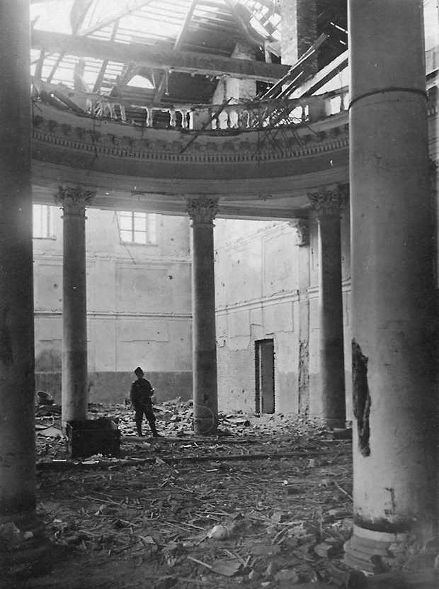 1916 р. Інтер’єр бальної залиРозмір зображення: 620:831 піксел Фото з квітня 1916 р. з альбому «Дубенський форт-застава» . В центрі – австрійський вояк. |