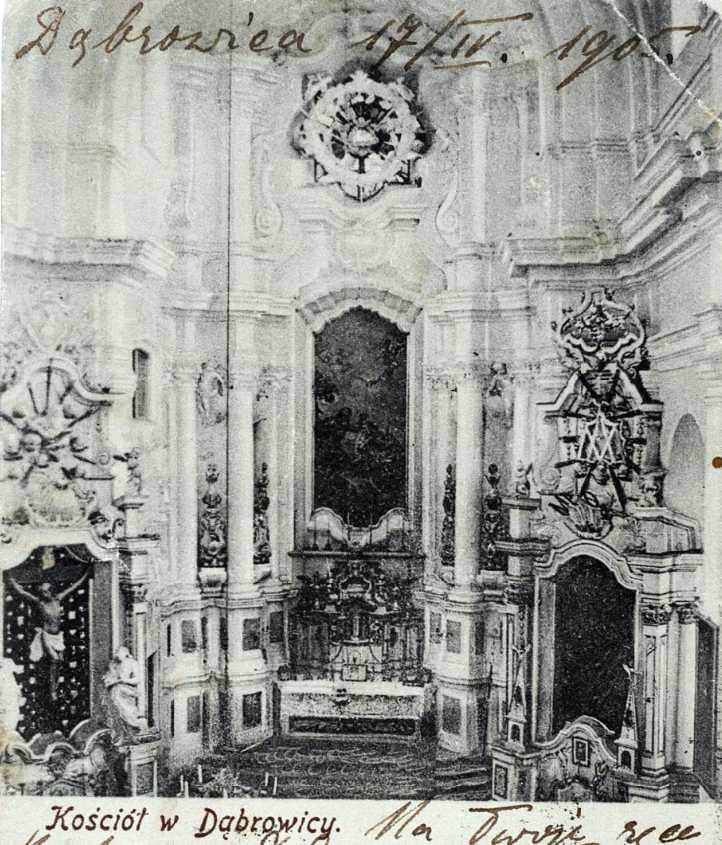 1905 р. Інтер’єрРозмір зображення: 722:845 піксел Поштівка: костел у Дубровиці. – Kościół w Dąbrowicy. [S.l. : s.n., 1905] (pocztówka); 13 × 9 cm |