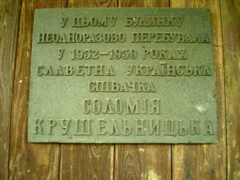 Меморіальна дошка з написом: «У цьому будинку неодноразово перебувала у 1932 – 1939 роках славетна українська співачка Соломія Крушельницька».