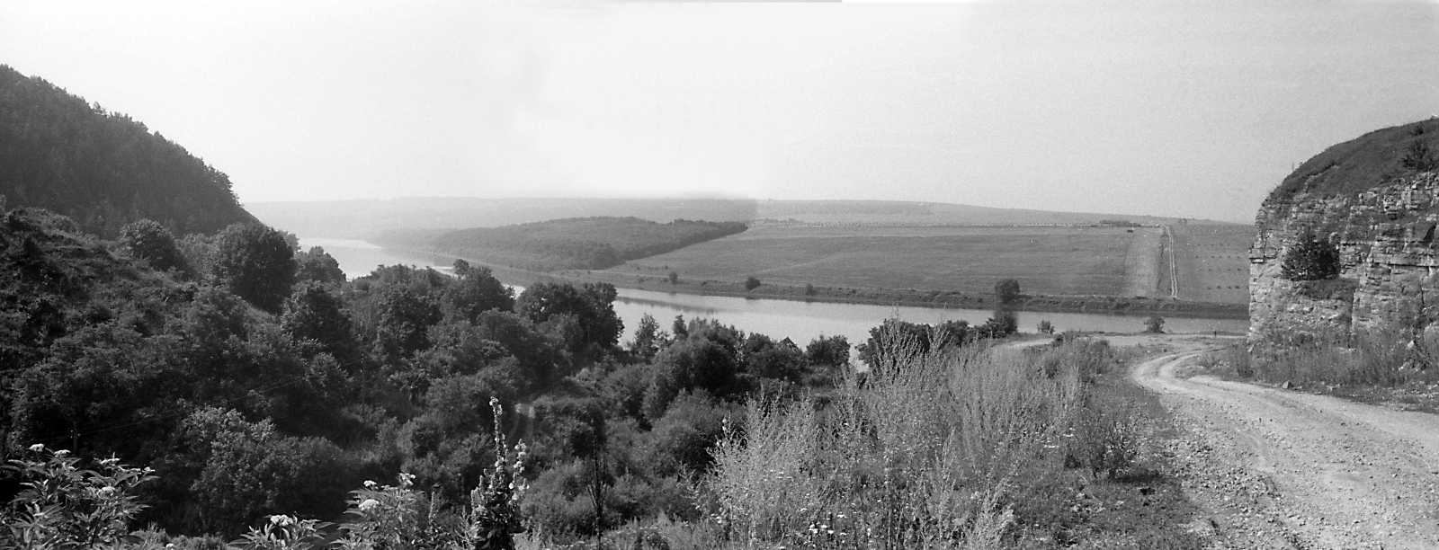 1991 р. Панорама яру і Дністра біля с. ДзвенигородРозмір зображення: 1600:612 піксел 1991 р. 20 липня. Фото М.І.Жарких. Негатека, № 685-19+20. |