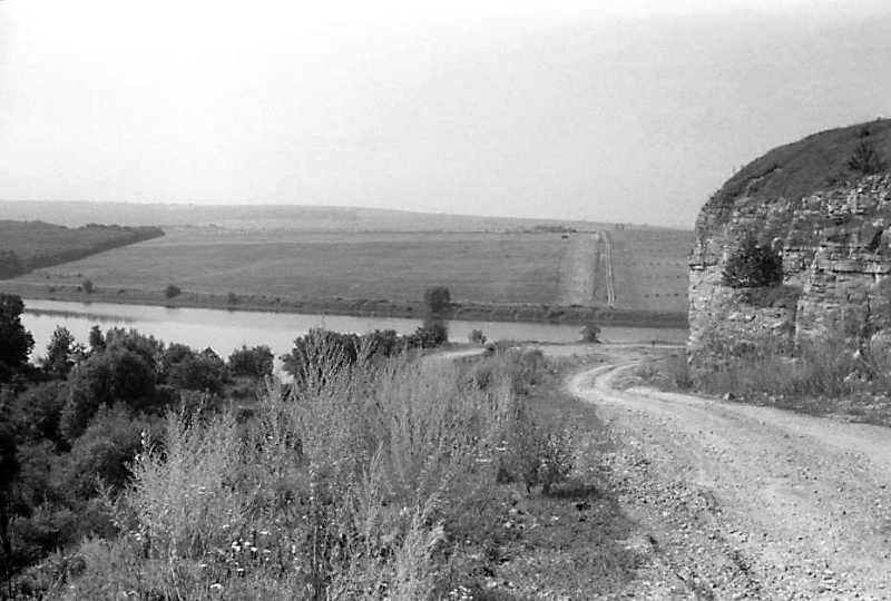 На плато праворуч знаходиться городище. Вертикально підрубана скеля, на мою думку, належить не до городища, а до дороги, яка спускається до Дністра.