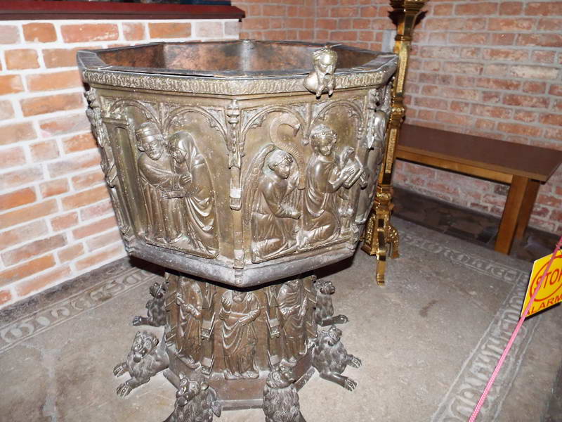 Чаша для хрещення, 1387 р. відлита майстром Бернхузером. Має багату пластику і є одним з найцінніших предметів мистецтва в ельблонзьких колекціях. Рельєфи зображують пророків костелу. Оздобну кришку чаші знищила пожежа 1777 р. Фото Івана Парнікози, 30 червня 2015 р.
