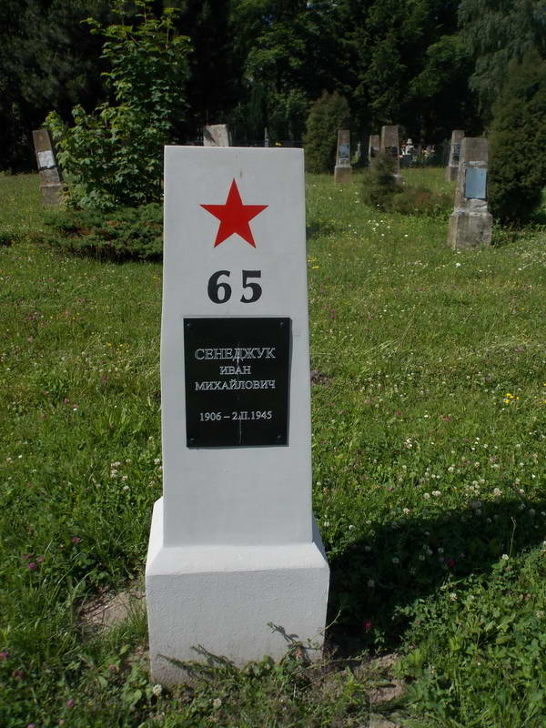 Могила Сенеджука Івана МихайловичаРозмір зображення: 600:800 піксел Могила Сенеджука Івана Михайловича (1905-02.02.1945 р.). Фото Івана Парнікози, 25 червня 2014 р. |