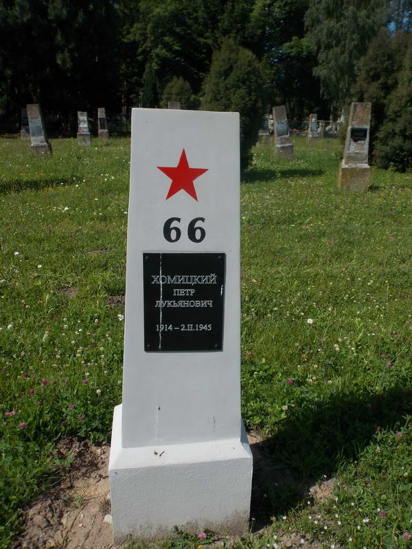 Могила Хомицького Петра Лук'яновичаРозмір зображення: 600:800 піксел Могила Хомицького Петра Лук'яновича (1914-02.02.1945 р.). Фото Івана Парнікози, 25 червня 2014 р. |