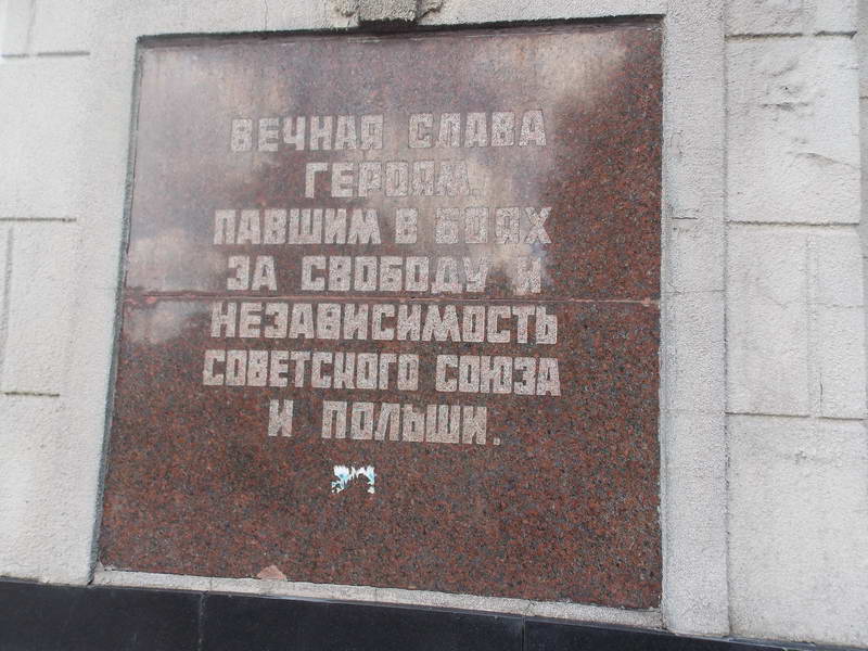 Радянський військовий цвинтар на вул. Агрикола в Ельблонгу. Фрагмент пам'ятника. Напис: Вічна пам'ять героям, що пали в боротьбі за незалежність Радянського Союзу та Польщі. Фото Івана Парнікози, 25 червня 2014 р.