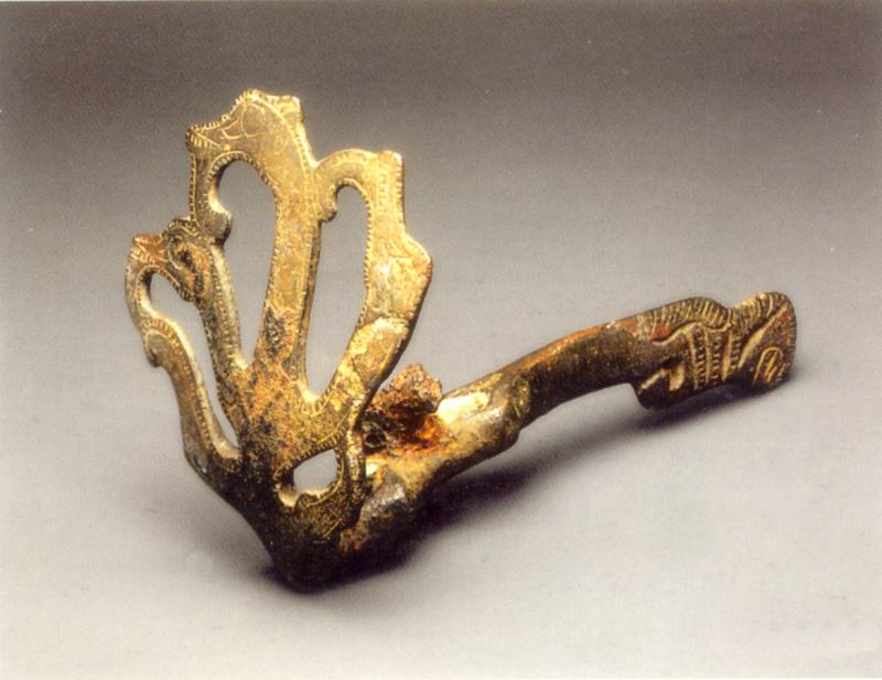 Псалий меотского типа с остатком кольца железных удил. Один конец псалия завершается звериной головой с птичьим клювом. На противоположном конце – ажурная пластина, оформленная наподобие своеобразной зооморфной пальметки, скомпонованной из птичьих голов. Детали изображений нанесены гравировкой. Изделие выполнено в графической манере, свойственной многим образам меото-скифского искусства Прикубанья.