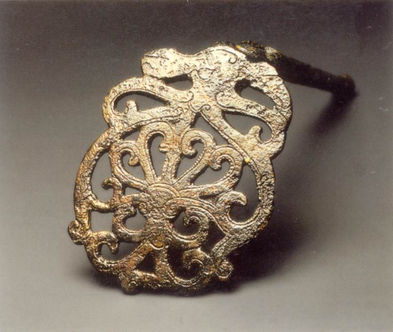Не сразу можно заметить стилизованную головку оленя, помещенную в основании ажурного пластинчатого завершения псалия. Показанная в профиль, она почти теряется среди огромных рогов оленя, превращенных в замысловатую, чисто орнаментальную композицию.