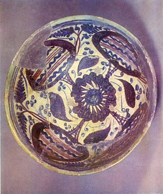 Чаша на кольцевом поддоне. Подглазурная роспись кобальтом и марганцем по белому ангобу украшает внутреннюю поверхность. Мотив орнамента – растительный стилизованный. На внешней поверхности горизонтальная полоса, нанесенная зеленой прозрачной глазурью. Принадлежит к группе привозных восточных изделий.