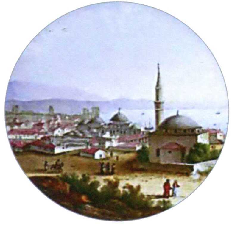 Вид Феодосії з мечетями Муфті-джамі та Сулеймана. Розпис тарілки з сервізу, 1 чв. 19 ст. [Гайворонський О. Країна Крим. – К.: Майстер книг, 2017 р., c. 301]