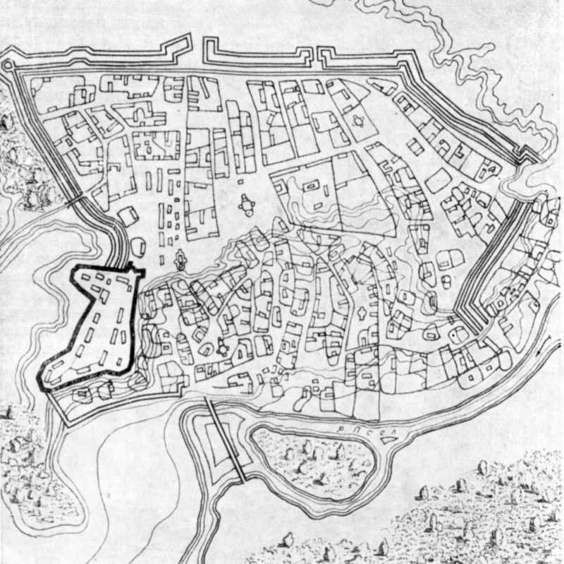18 ст. План містаРозмір зображення: 800:799 піксел г. Гадяч. План XVIII в. Чертежная копия с оригинала (ЦГВИА, ф. 418, д. 574) (стр. 49) Джерело: Цапенко М. Архитектура левобережной Украины XVII – XVIII веков. – М.: 1967 г., с. 49. |