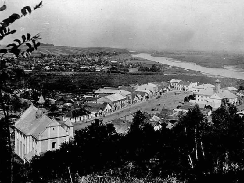 1916 р. (?) Вид костела і ринкової площі від замкуРозмір зображення: 800:599 піксел Фото 1914..1916 рр. опубліковано на сторінці «Мандрівка старим кордоном» 27.06.2021 р. Праворуч – ратуша, зруйнована, як і костел. |