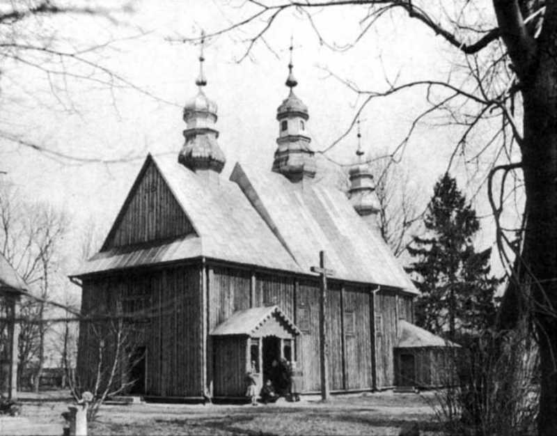 Дерев’яна церква в селі мусила існувати вже у XVII ст., бо у акті візитації 1726 р. про неї сказано: “Дерев’яна церква колись була, тепер лише дзвіниця дерев’яна”. 1 У 1739-1742 рр. збудовано нову дерев’яну тризруб-ну церкву старанням священика Петра Козакевича. 2 У1750 р. отримала привілеї від Ієроніма Флоріана Радивила. 3 Перед 1775 р. прибудовано з північної сторони нави каплицю з дахом, в баню виведеним. Акт візитації 1775 р. подає її докладний опис: