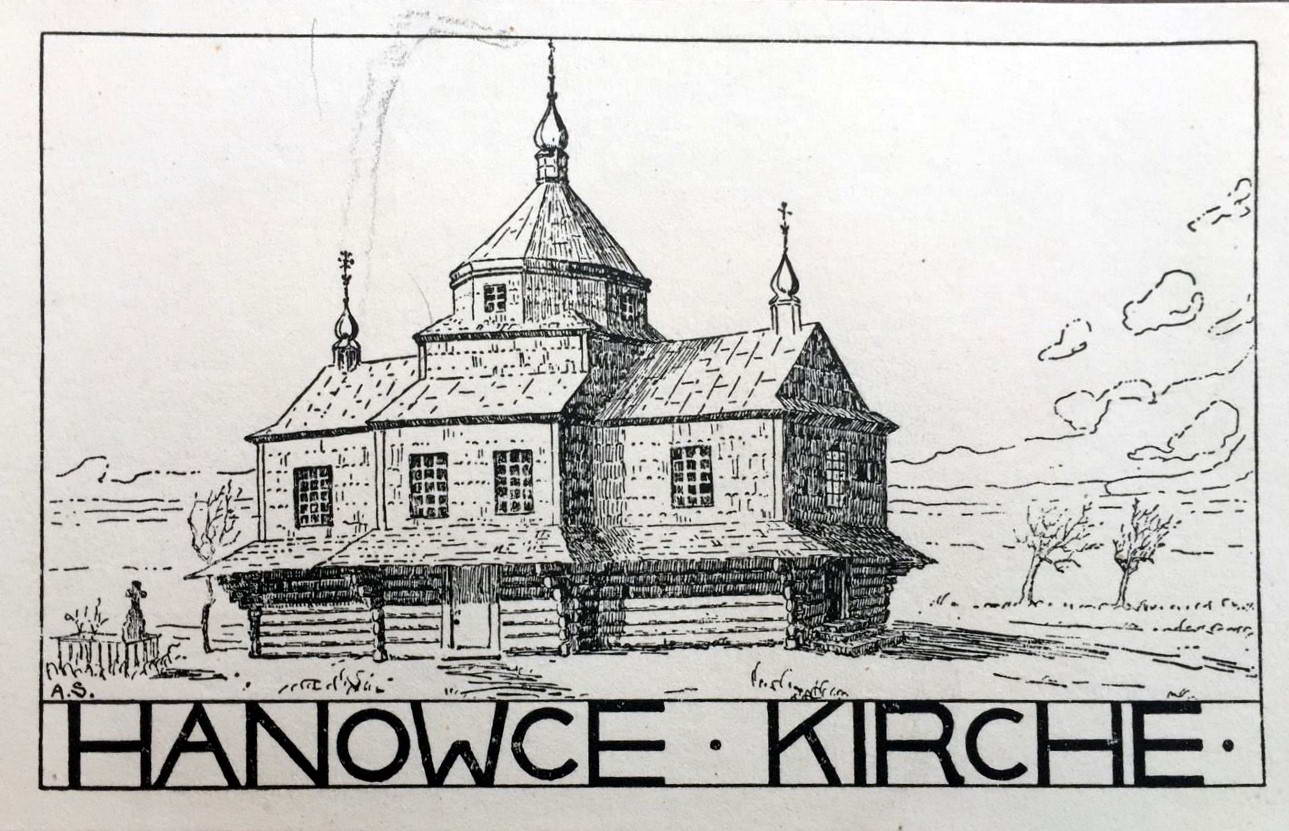 1916 р. Загальний виглядРозмір зображення: 1289:831 піксел Церква Св. арх. Михайла у Ганнівцях. Автор Антон Шютц, 1916 р. Зі статті: Василь Слободян Наші церкви чужими очима (16.07.2018) |