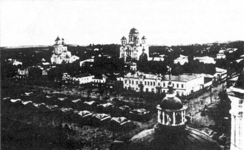 Загальний вигляд Базарного майдану з дзвіниці Троїцького собору. На передньому плані – соборні бані. Далі зліва направо: Спасо-Преображенська церкваздзвіницею,Трьоханастасіївська церква.