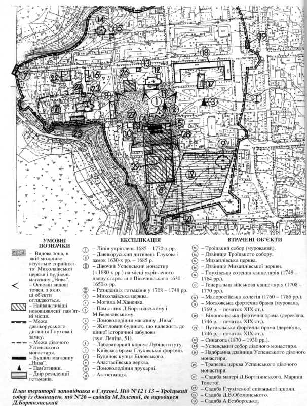 План території заповідника в ГлуховіРозмір зображення: 606:800 піксел План території заповідника в Глухові. Під № 12 і 13 – Троїцький собор із дзвіницею, під № 26 – садиба М.Толстої, де народився Д.Бортнянський. |
